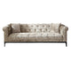 a traditional design and an all time classic. It has tufted seats and back rest and round scroll arm rests. The fabric used is unique in its texture which has a velvet like feel but with more detail. It is a very neutral colour that will blend in with most settings.